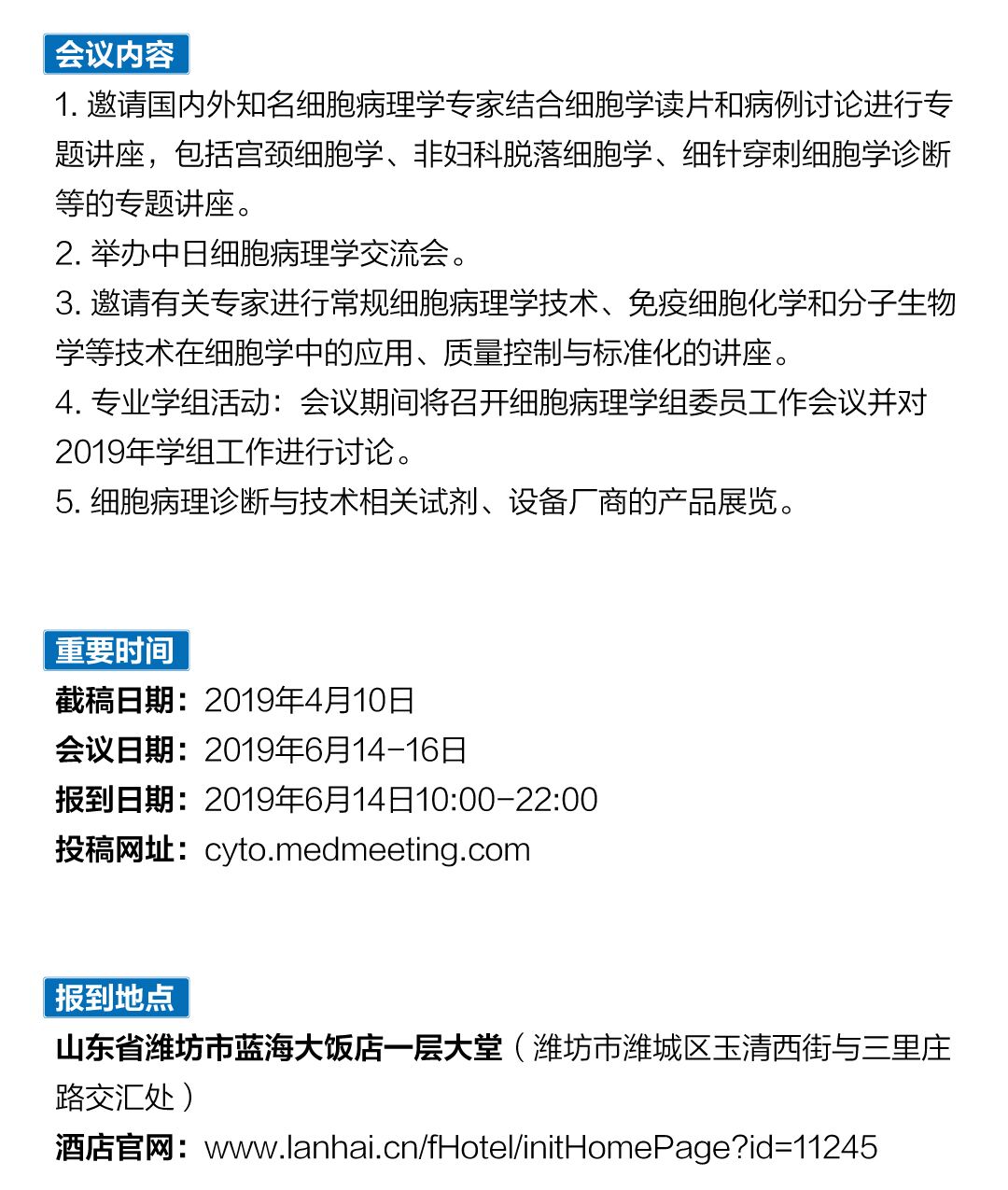 中华医学会病理学分会、中华医学会病理学分会细胞病理学组经讨论定于2019 年6 月14-16 日在山东省潍坊市举办中华医学会第十七届全国细胞病理学会议,会议预计将有全国各地的病理专家、主任、技术骨干等400 余位大会代表出席,会议将邀请国内多位知名的细胞病理学专家结合细胞学读片进行专题报告及读片讨论。